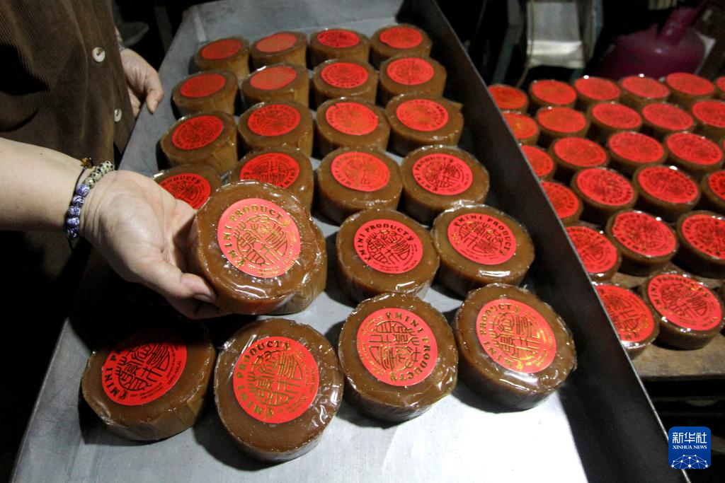 1月17日,在印度尼西亚梭罗,工人在一家糕点作坊展示包装好的年糕。