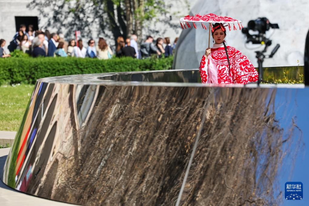 4月11日,在意大利米兰国立大学,演员在中国设计师陈耀光的镜面装置作品《礼物》中表演。