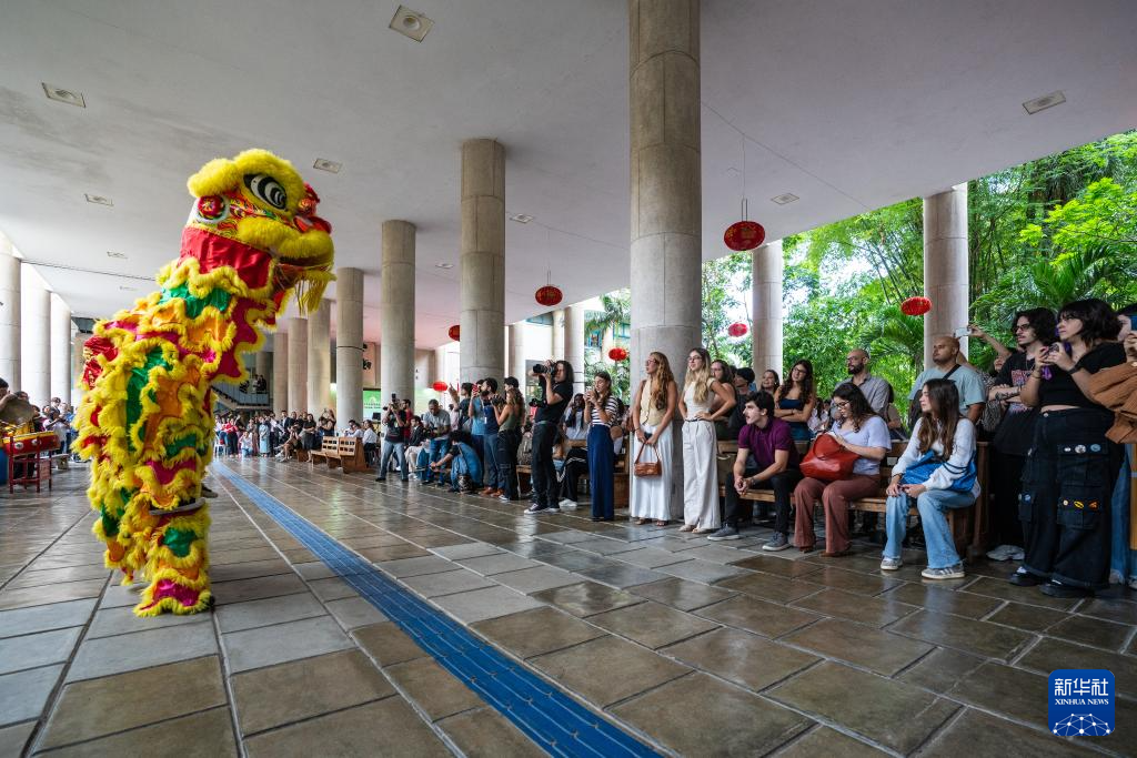 4月15日,在巴西里约热内卢天主教大学举办的“国际中文日”庆祝活动上,舞狮表演吸引人们驻足观看。