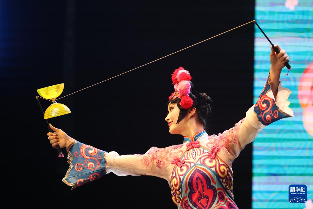 10月11日,在摩洛哥首都拉巴特举行的“天涯共此时”中秋晚会上,艺术家表演木偶长绸节目《秋月》。