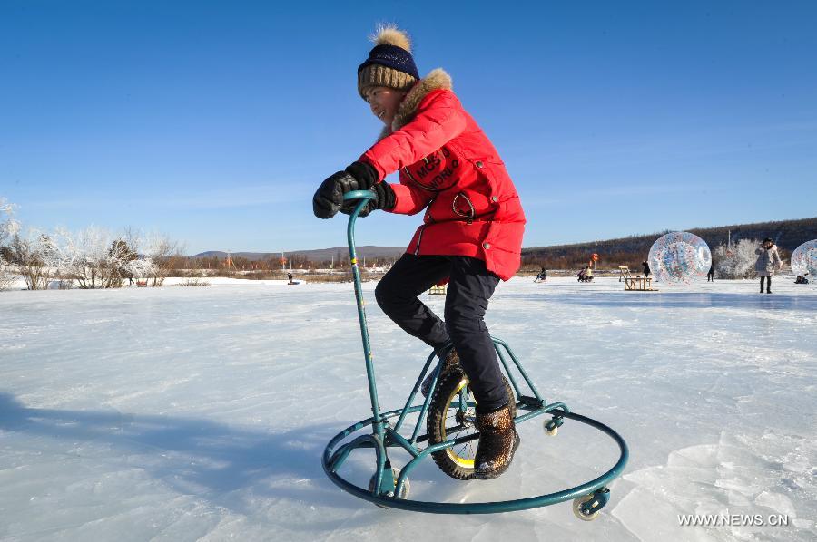 A boy rides a special bicycle on ice at Mangui Township in Hulunbuir, north China's Inner Mongolia Autonomous Region, Dec. 22, 2017. The 2017 Greater Khingan Ice and Snow Festival closed here on Friday. (Xinhua/Li Renzi)
