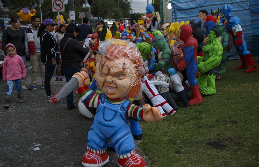 Photo taken on Dec. 27, 2017 shows dolls for sale in Quito, capital of Ecuador. Some countries of Latin America have the tradition of burning paper and wood dolls around the arrival of a new year to bid farewell to the past and wish for future luck. (Xinhua/Santiago Armas)