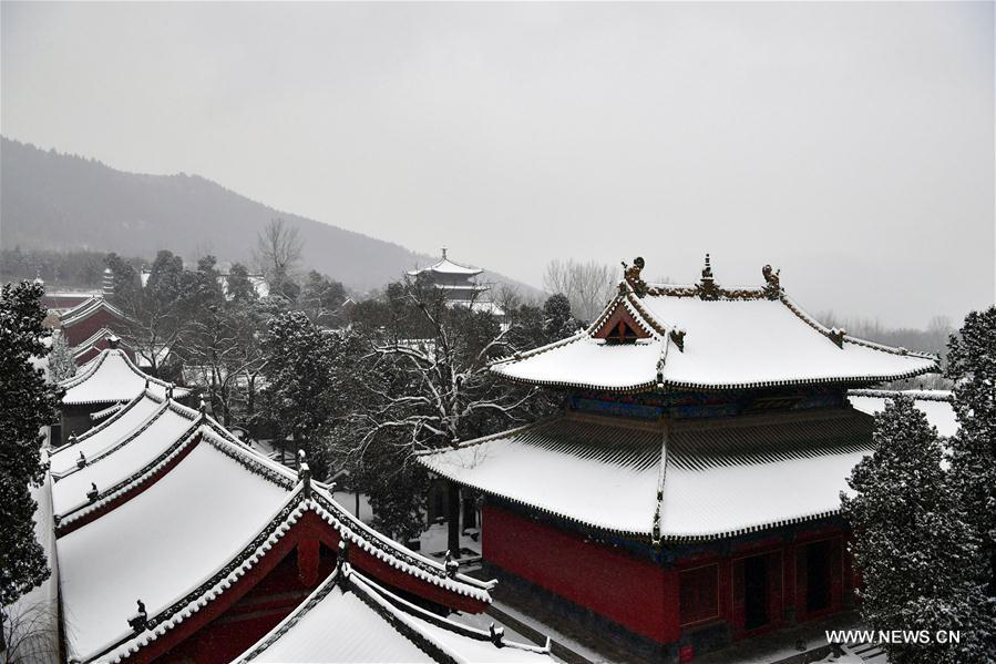 Photo taken on Jan. 4, 2018 shows the snow-covered Shaolin Temple on the Songshan Mountain in central China's Henan Province. Many places across China greeted snowfall recently. (Xinhua/Feng Dapeng)