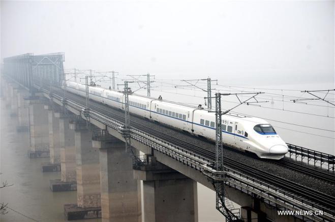 A bullet train passes through the Poyang Lake Bridge of Jiujiang-Jingdezhen-Quzhou railway line in Jiujiang, east China's Jiangxi Province, Dec. 28, 2017. The railway line linking Jiujiang of Jiangxi and Quzhou of Zhejiang went into operation on Dec. 28, 2017. (Xinhua/Bao Gansheng)