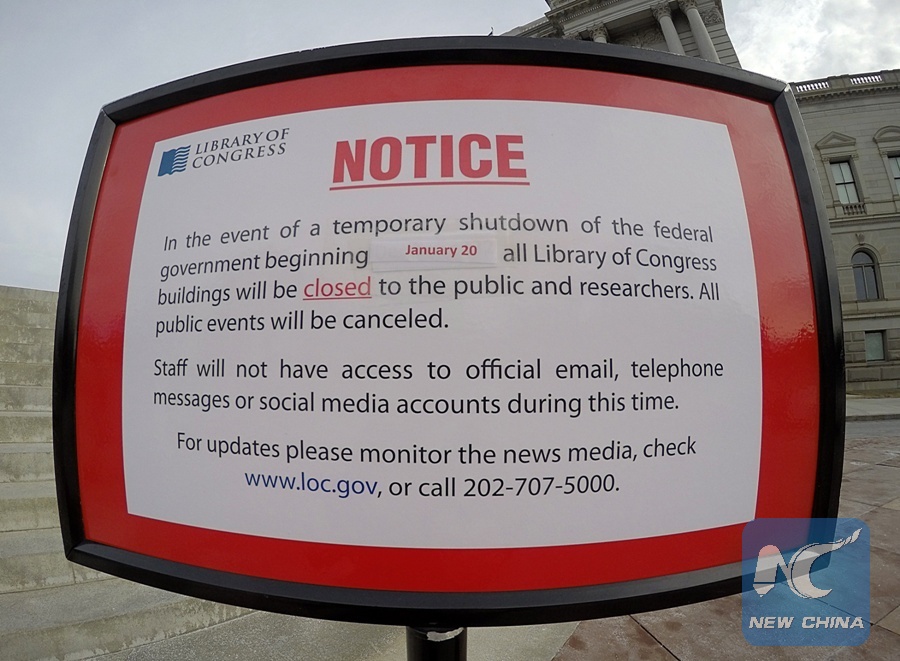 A notice indicating that the Library of Congress buildings are closed due to the federal government shutdown is seen in Washington D.C., the United States, on Jan. 22, 2018. (Xinhua/Yin Bogu)