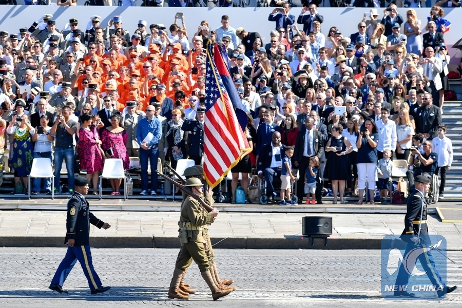 U.S. troops march during the annual Bastille Day military parade on the Concorde Square in Paris, France, on July 14, 2017. (Xinhua/Chen Yichen)