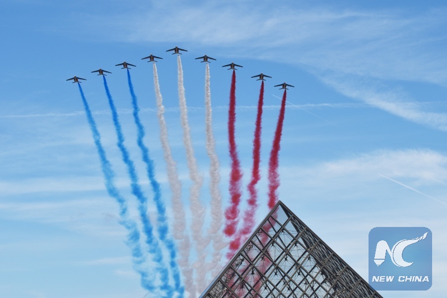 French Alphajets of the Patrouille de France fly over the Pyramid of the Louvre Museum during the annual Bastille Day military parade in Paris, France, on July 14, 2017. (Xinhua/Li Genxing)