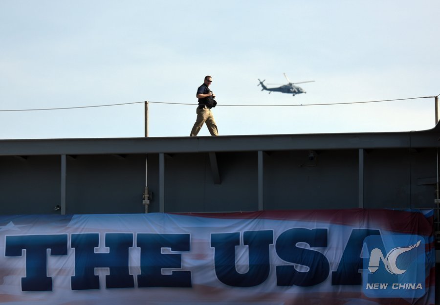 A soldier patrols on USS Gerald R. Ford before its commissioning ceremony at Naval Station Norfolk, Virginia, the United States, on July 22, 2017. (Xinhua/Yin Bogu)