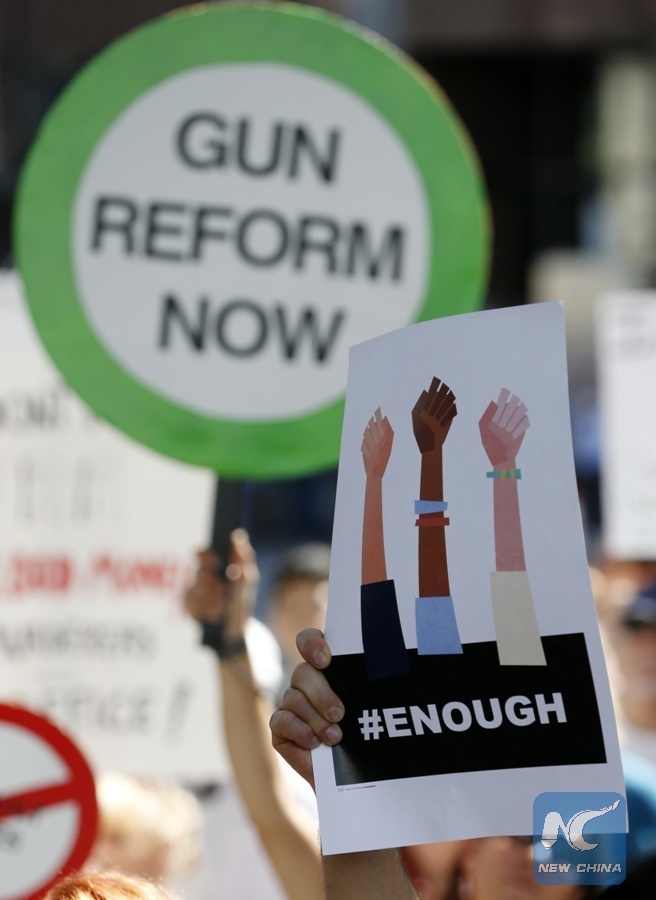 In this file photo taken on Feb. 17, 2018, protesters hold signs at a rally for gun control at the Broward County Federal Courthouse in Fort Lauderdale, Florida. (Xinhua/AFP)