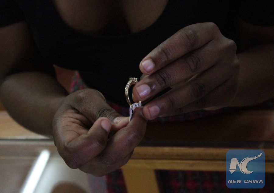 File photo shows a worker displaying a diamond ring for sale at the Aurex Diamonds, a subsidiary of the Reserve Bank of Zimbabwe in Harare, Zimbabwe, Aug. 3, 2016. (Xinhua/Stringer)