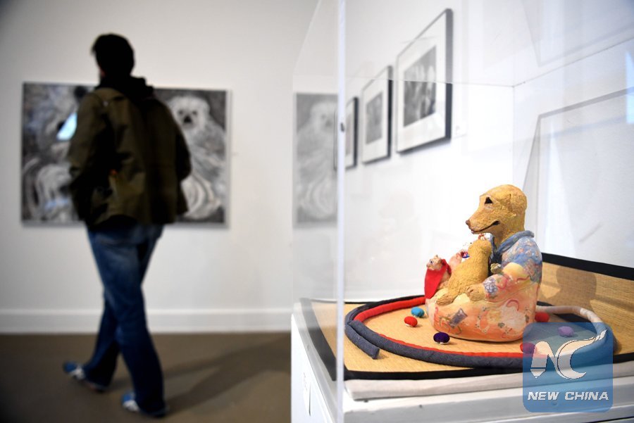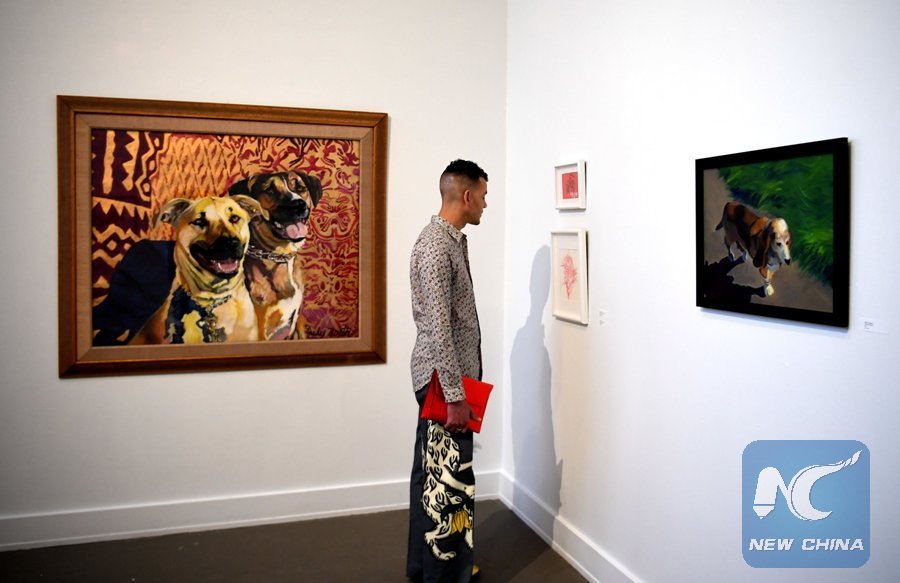 People visit an exhibition at Chinese Culture Center of San Francisco in San Francisco, the United States, on Feb. 22, 2018. Chinese Culture Center of San Francisco celebrated Chinese New Year of the Dog with a dog-themed artwork exhibition. (Xinhua/Wu Xiaoling)