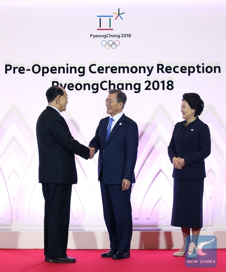 Kim Yong Nam (L), the president of the Presidium of the Supreme People's Assembly of the Democratic People's Republic of Korea (DPRK), is welcomed by South Korean President Moon Jae-in and his wife before a pre-opening ceremony reception of the PyeongChang Winter Olympics in PyeongChang, South Korea, Feb. 9, 2018. (Xinhua/Yao Dawei)