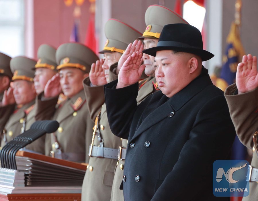 This picture provided by Korean Central News Agency (KCNA) on Feb. 9, 2018 shows the top leader of the Democratic People's Republic of Korea (DPRK) Kim Jong Un attending the military parade marking the 70th anniversary of the founding of Korean People's Army in Pyongyang, capital of the DPRK. (Xinhua/KCNA)