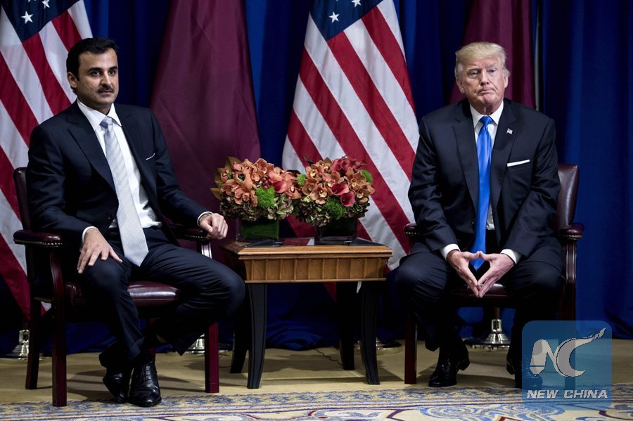 File Photo: Qatari Emir Tamim bin Hamad Al Thani (L) and U.S. President Donald Trump wait for a meeting at the Palace Hotel on Sept. 19, 2017 in New York City, on the sidelines of the United Nations General Assembly. (Xinhua/AFP)