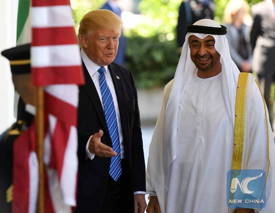 U.S. President Donald Trump (L) welcomes Sheikh Mohamed bin Zayed Al-Nahyan, Abu Dhabi Crown Prince of the United Arab Emirates (UAE), at the White House in Washington D.C., the United States, on May 15, 2017. (Xinhua/Yin Bogu)