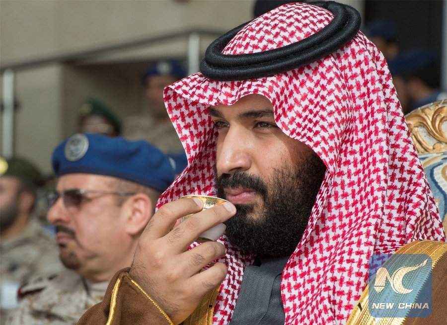 Saudi Arabia's Crown Prince Mohammed bin Salman drinks coffee during the graduation ceremony of the 93rd batch of the cadets of King Faisal Air Academy, in Riyadh, Saudi Arabia, Feb. 21, 2018. (Xinhua/REUTERS)