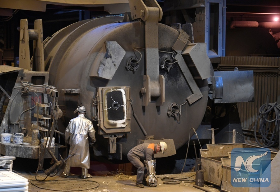 Workers of German steel manufacturer Salzgitter AG stand in front of a furnace at a plant in Salzgitter, Germany, March 1, 2018. (Xinhua/REUTERS)