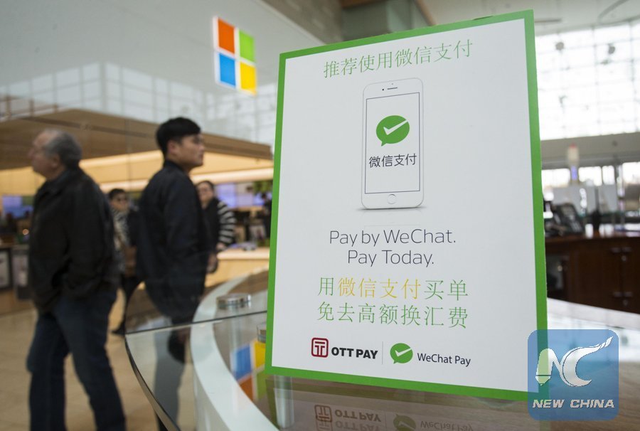 File Photo: A WeChat Pay logo is seen on a desk of service centre at Yorkdale Shopping Centre in Toronto, Canada, May 11, 2017. (Xinhua/Zou Zheng)