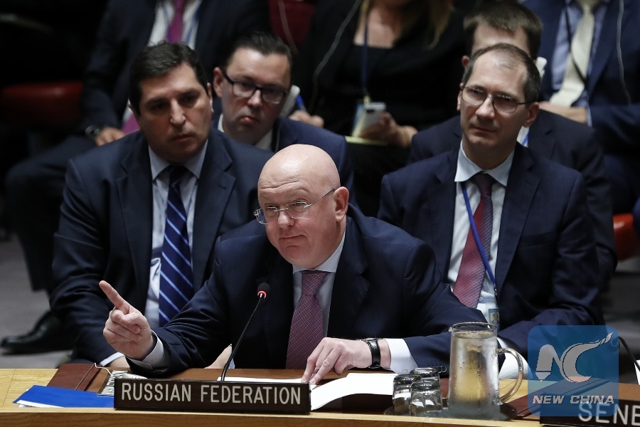 File Photo: Russian Ambassador to the United Nations Vassily Nebenzia (C, front) addresses the Security Council before he vetoes a Security Council draft resolution at the UN headquarters in New York, on Oct. 24, 2017. (Xinhua/Li Muzi)