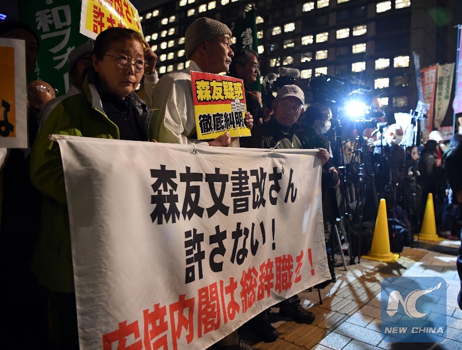 TOKYO, March 20 (Xinhua) -- Japanese Prime Minister Shinzo Abe has been under fire amid a deepening cronyism and document-tampering scandal, which has drastically brought down his cabinet's approval ratings, while people staged protests across Japan calling for the cabinet's resignation.