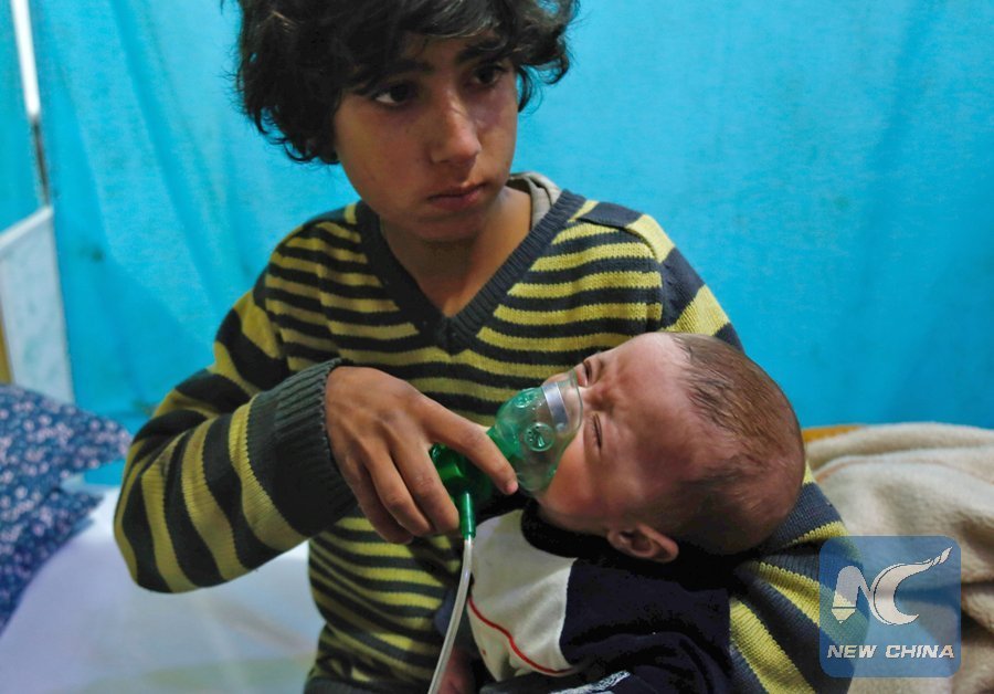 A Syrian boy holds an oxygen mask over the face of an infant at a make-shift hospital following a reported gas attack on the rebel-held besieged town of Douma in the eastern Ghouta region on the outskirts of the capital Damascus on Jan. 22, 2018. (Xinhua/AFP)