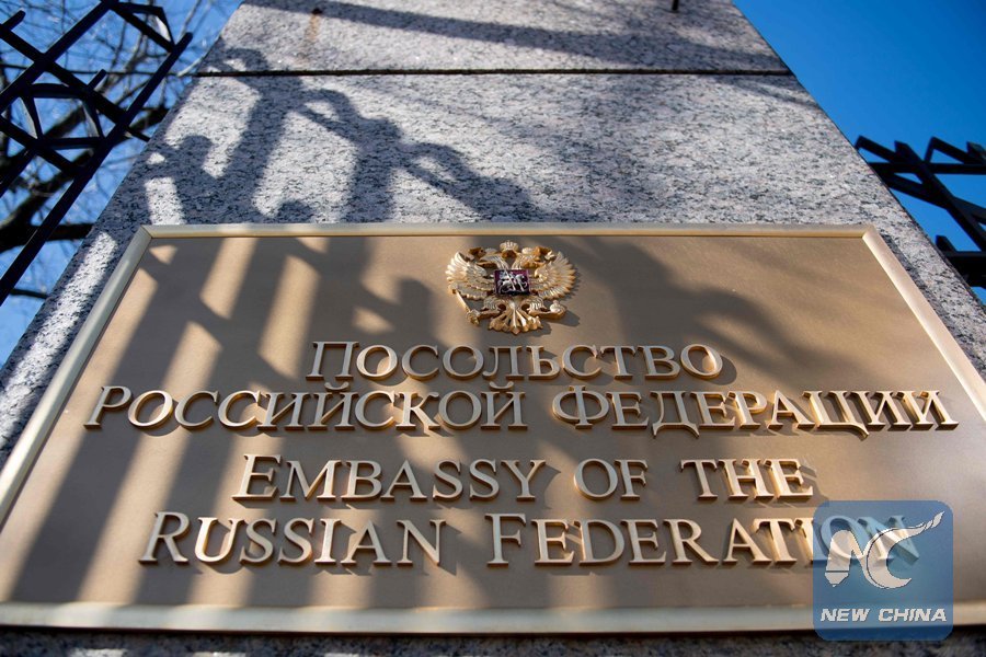A sign for the Russian Embassy is seen in Washington, D.C., on March 26, 2018. (Xinhua/AFP)