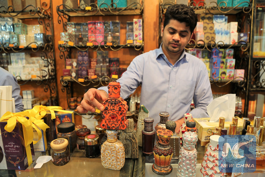 A Kuwaiti perfume salesman displays colorful bottles of perfume at the International Perfumes and Cosmetics Exhibition in Kuwait City, on April 3, 2018. (Xinhua/Nie Yunpeng)