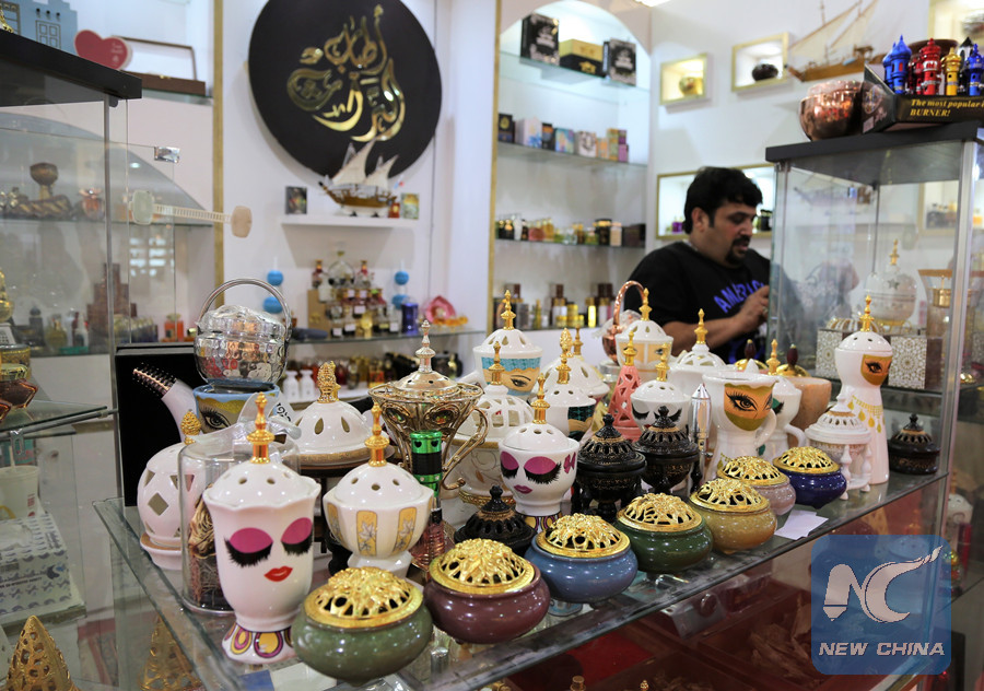 Incent burners, many of them are made in China, are on display at the International Perfumes and Cosmetics Exhibition in Kuwait City, on April 3, 2018. (Xinhua/Nie Yunpeng)