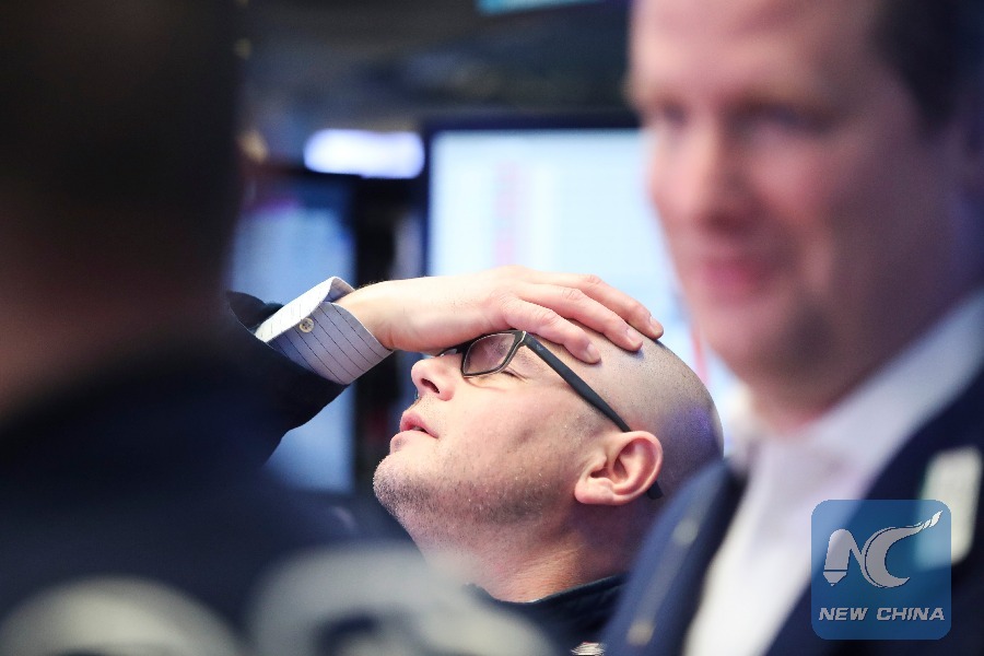 A trader has a rest after market closing at the New York Stock Exchange in New York, the United States, March 22, 2018. U.S. stocks ended lower on Thursday, with the Dow plunging over 700 points, after the U.S. President Donald Trump announced to impose tariff on imported products from China. (Xinhua/Wang Ying)
