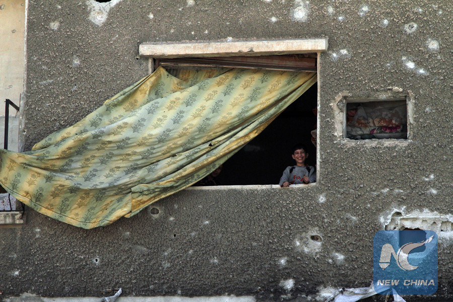 A Syrian boy looks out of his shattered home's window in the largely-devastated district of Douma, east of the capital Damascus, on April 20, 2018. (Xinhua/Hummam Sheikh Ali)