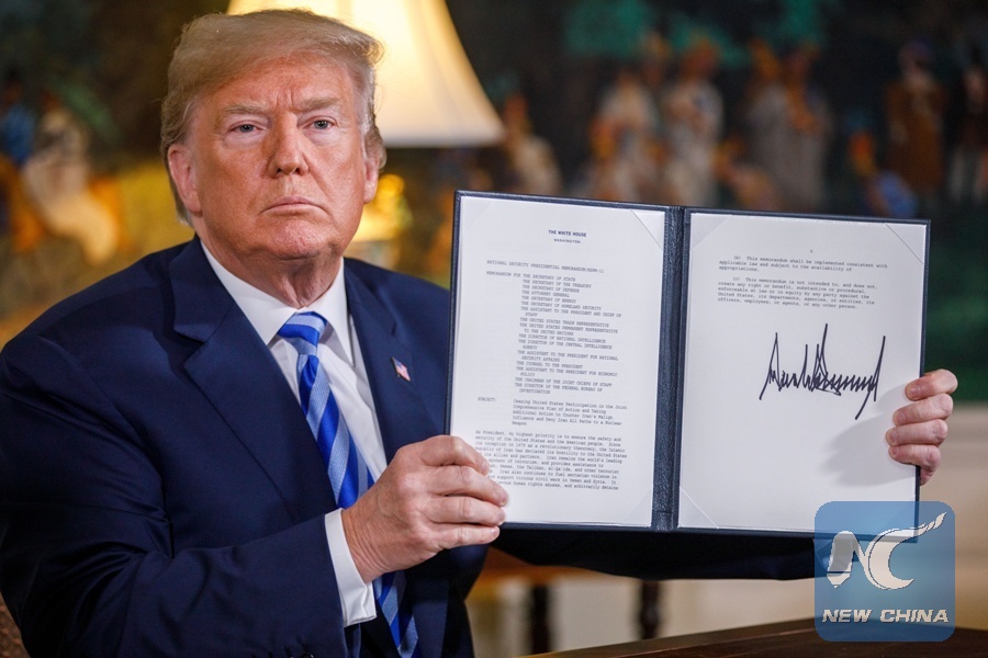 WASHINGTON, May 8 (Xinhua) -- U.S. President Donald Trump said on Tuesday that he will withdraw his country from the Iran nuclear deal, a decision that immediately drew global frustration and outcry.