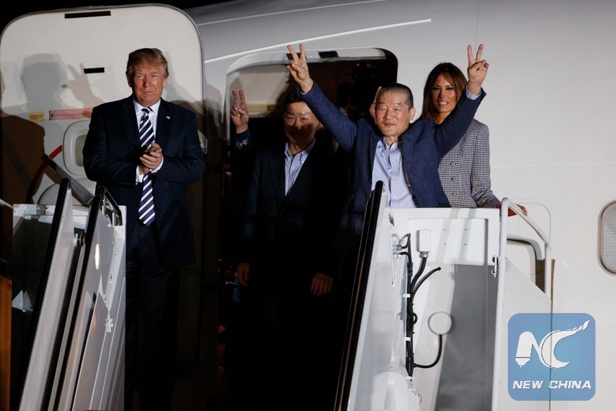 WASHINGTON, May 10 (Xinhua) -- Three U.S. citizens that were just freed by the Democratic People's Republic of Korea (DPRK) arrived in Washington early Thursday, as the two countries saw their ties warm up in recent weeks.