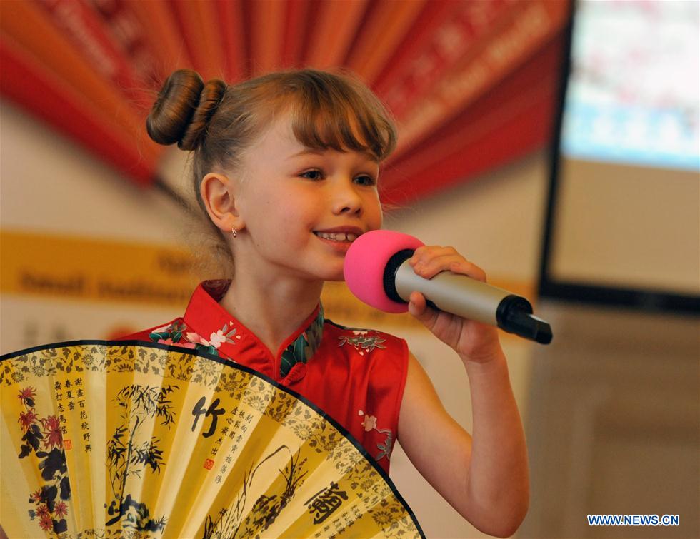 A girl performs during the "Chinese Bridge" competition in Riga, Latvia, on April 25, 2018. In recent years, a surge in the learning of the Chinese language has been observed around the world. Confucius institutes and classrooms worldwide play an undeniable role in the process of bringing the Chinese language and culture closer to the international community.
