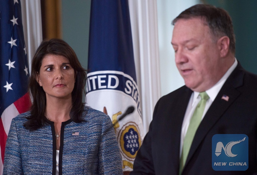 U.S. Secretary of State Mike Pompeo speaks as U.S. Permanent Representative to the United Nations Nikki Haley looks on at the U.S. Department of State in Washington D.C. on June 19, 2018. (Xinhua/AFP)