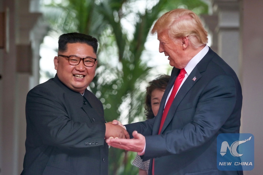 File Photo: Top leader of the Democratic People's Republic of Korea (DPRK) Kim Jong Un (L) meets with U.S. President Donald Trump in Singapore, on June 12, 2018. (Xinhua/The Straits Times)