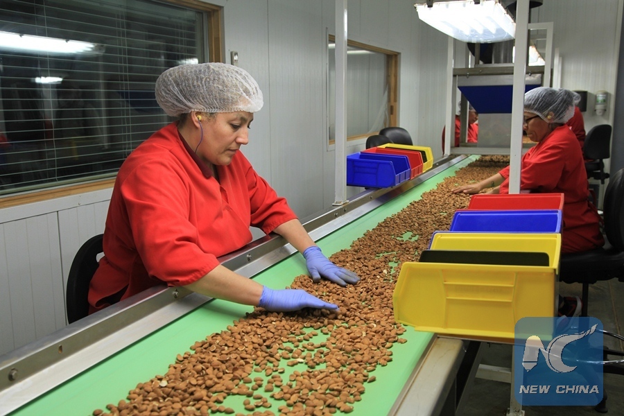 Workers process almond at a processing plant of Travaille and Phippen, an almond growing and processing enterprise, in Modesto, the United States, on April 25, 2018. (Xinhua/Gao Shan)