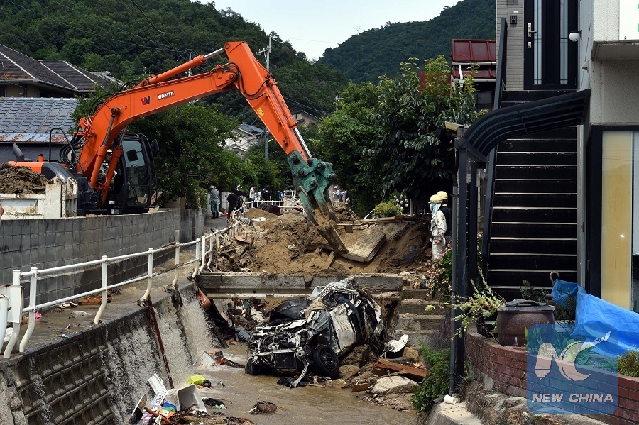 Rescue workers clear mud and debris in Kure, Hiroshima, southwestern Japan, July 11, 2018. (Xinhua/Ma Ping)