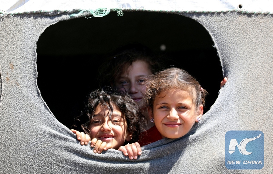 Internally displaced girls from Deraa province look out from a hole near the Israeli-occupied Golan Heights in Quneitra, Syria July 11, 2018. (Xinhua/REUTERS)