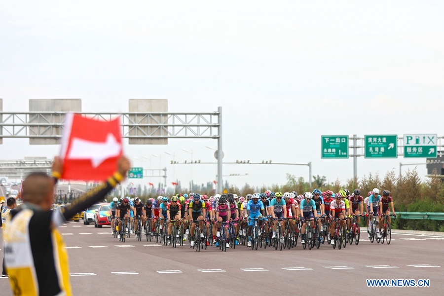 Cyclists compete in the twelfth stage of the Tour of Qinghai Lake in Yinchuan, northwest China's Ningxia Hui Autonomous Region, on August 3, 2018. (Xinhuanet Photo by Jia Haiyuan)