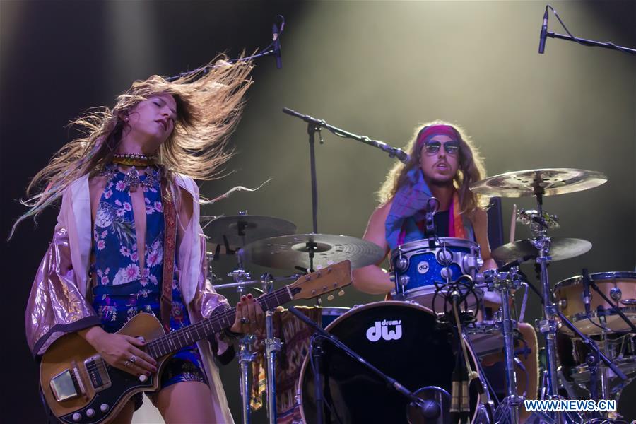 Vocalist Cato van Dijck (L) and her brother drummer Joost van Dijck perform with their Dutch-New Zealand band My Baby at their concert on the A38 Stage at the Sziget Festival held in Budapest, Hungary on Aug. 13, 2018. (Xinhua/Attila Volgyi)?