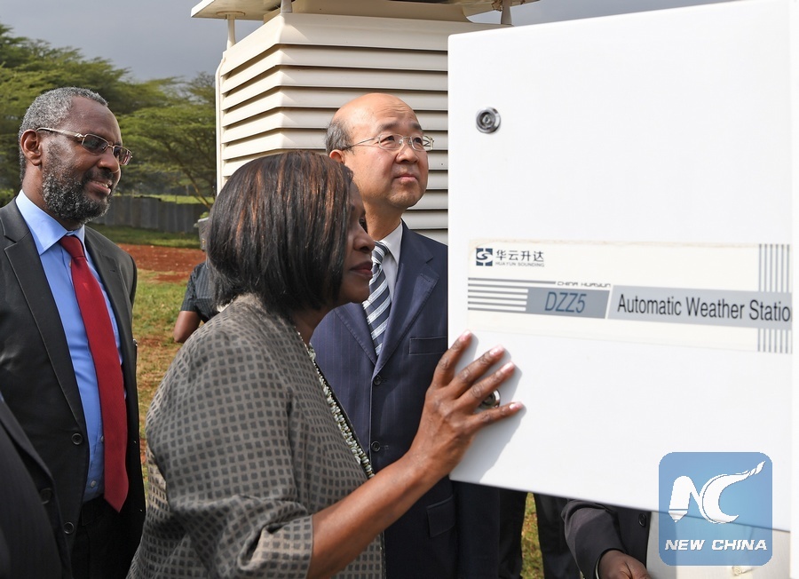 File photo shows then Chinese Ambassador to Kenya Liu Xianfa (R) and Kenya's Secretary for Environment and Natural Resources Judi Wakhungu (C) view the China-aided automatic weather station during the handover ceremony in Nairobi, capital of Kenya, Sept. 11, 2017. Kenya's Ministry of Environment on Monday benefited from an automated weather forecast device donated by China as efforts to upgrade meteorological services in the East African nation gathers steam. (Xinhua/Chen Cheng)