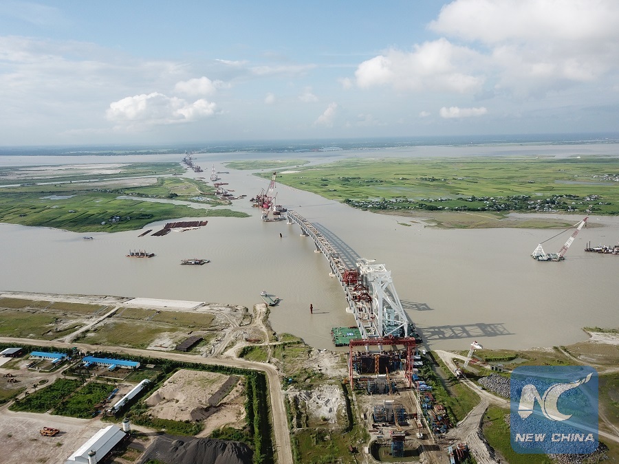 Photo taken on June 29, 2018 shows the construction site of the fifth span of the Padma Bridge on the outskirts of Dhaka, capital of Bangladesh. (Xinhua)