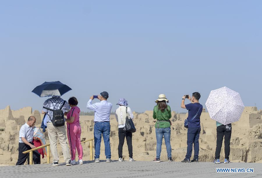 Tourists visit the Jiaohe ancient city ruins in Turpan, northwest China's Xinjiang Uygur Autonomous Region, Sept. 19, 2018. Xinjiang saw more than 105 million tourists in the first eight months of 2018, up 40.93 percent year on year, according to the Xinjiang tourism development commission. (Xinhua/Zhao Ge)