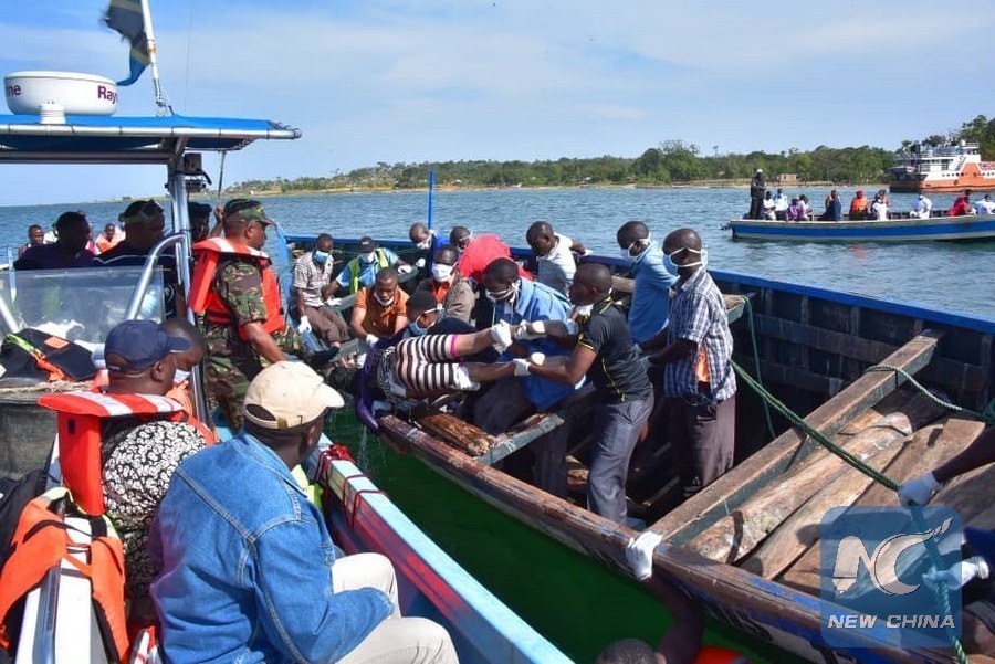 Photo taken on Sept. 21 shows the scene of rescue. According to sources, Tanzania's Lake Victoria passenger ferry, with a capacity of 101 passengers and 25 tonnes of cargo, capsized at around 1:00 p.m. local time Thursday. (Xinhua)