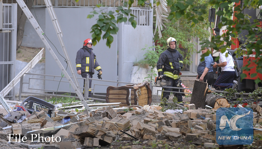 Firefighters inspect the explosion site of a gas explosion in Moscow, Russia, May 22, 2014. (Xinhua/Jia Yuchen)