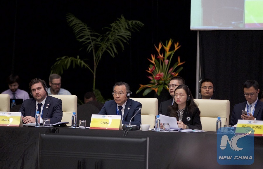 China's Vice Finance Minister Yu Weiping (C, front) attends the Asia-Pacific Economic Cooperation (APEC) Finance Ministers Meeting held in Port Moresby, Papua New Guinea, Oct. 17, 2018. (Xinhua/Hao Yalin)