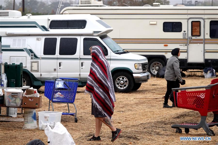 Residents walk in rain at a parking lot in Chico of Butte County, California, the United States, Nov. 21, 2018. Local officials warned that the rain after the wildfire could cause risk of flash floods and mudflows. (Xinhua/Wu Xiaoling)