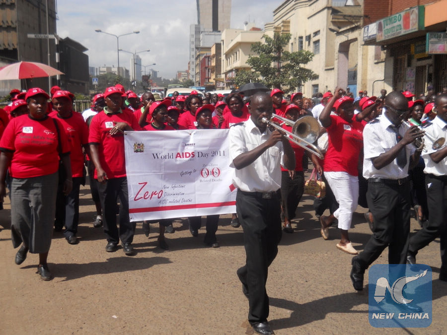 File photo shows residents marching along the streets in Nairobi, capital of Kenya, to mark the World AIDS Day, Dec. 1, 2011. (Xinhua/Daniel Namale)