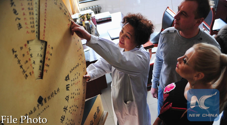 Li Li (1st, L), a traditional Chinese physician, introduces knowledge of traditional Chinese medical science to Ukrainian doctors at a hospital in Qingyang City, northwest China's Gansu Province, Dec. 28, 2013. (Xinhua/Chen Bin)