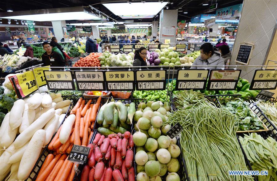 Customers select vegetables at a supermarket in Handan, north China's Hebei Province, Dec. 9, 2018. China's consumer price index (CPI), a main gauge of inflation, rose 2.2 percent year on year in November, down from 2.5 percent in October, the National Bureau of Statistics (NBS) said Sunday. (Xinhua/Hao Qunying)